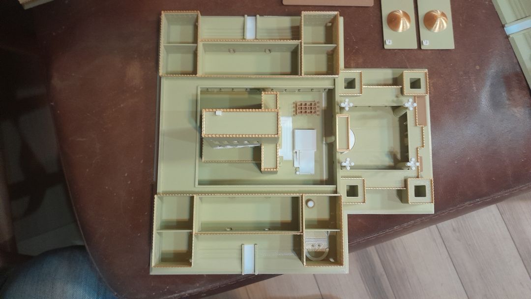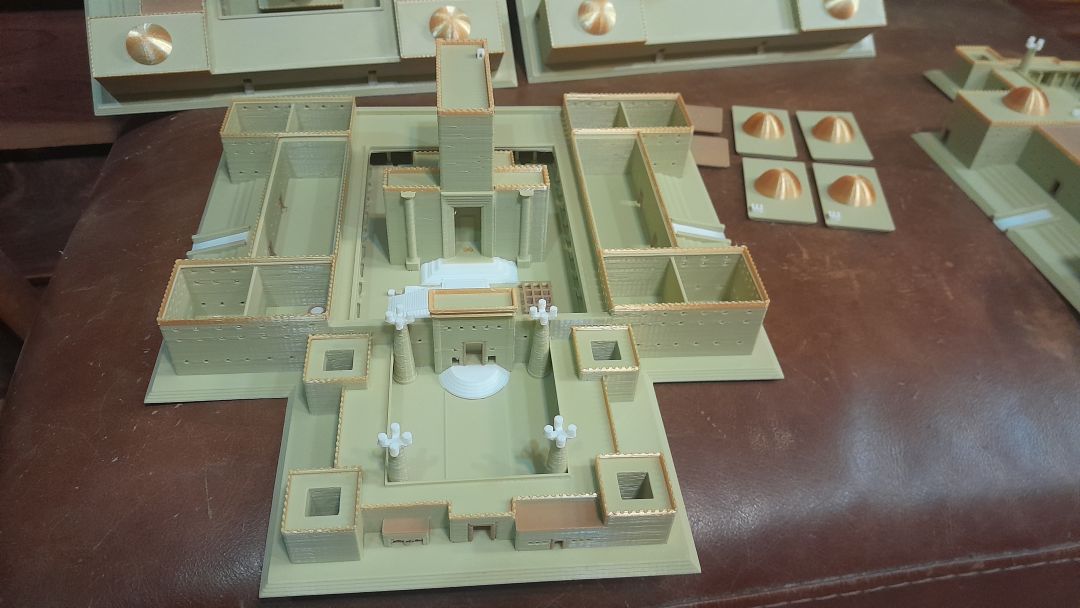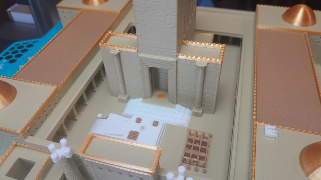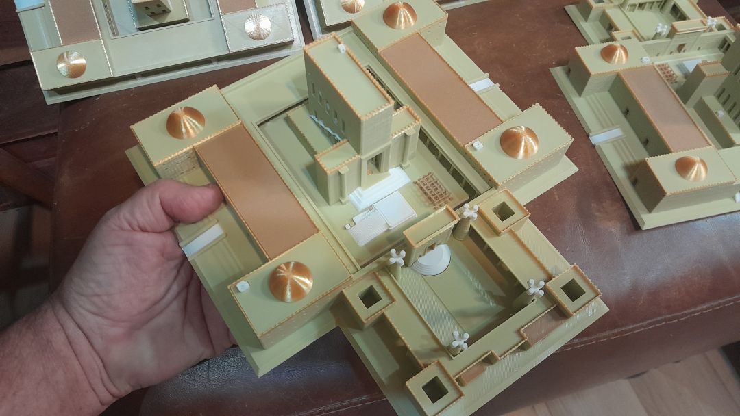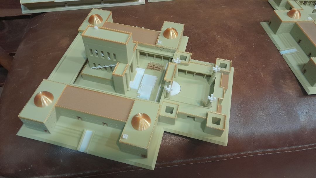 The models are 9.6 inches from front to back. The models feature 6 removable roofs and are the perfect size to hold in one hand during demonstrations or teachings on camera. The Southeast corner building features the Sanhedrin seating area and the kior for washing before entering for service. A gold dot has been placed on the temple porch to display the area the priest must observe during the slaughter of the red heifer. The colors provide enhanced definition for easy explanation of all matters Temple.